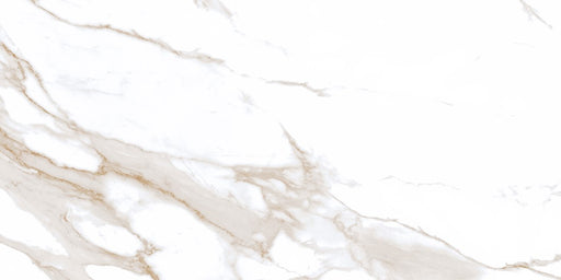 Transform your interiors with the exquisite Calcatta Gold Marble Effect Polished Tile, a symbol of refined luxury and timeless elegance. Perfect fo...
