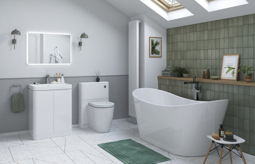 Upgrade your bathroom with the Matt White 600mm Wall Hung Basin Vanity Unit, Rimless Close Coupled WC, and Chrome Basin Mixer Tap from Luxury Bathr...