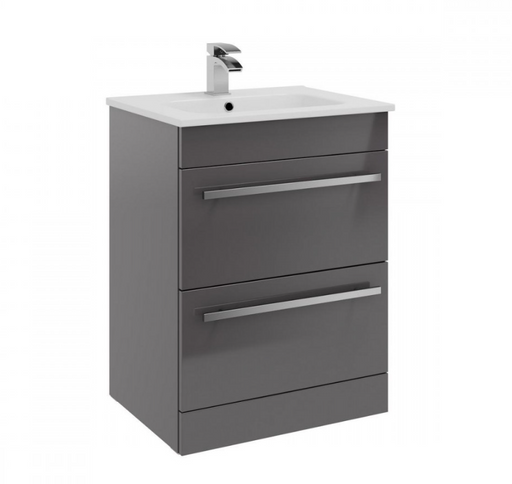 Manufactured in Britain, this two drawer grey gloss floorstanding vanity unit is the perfect addition for the contemporary bathroom. Chrome handle...